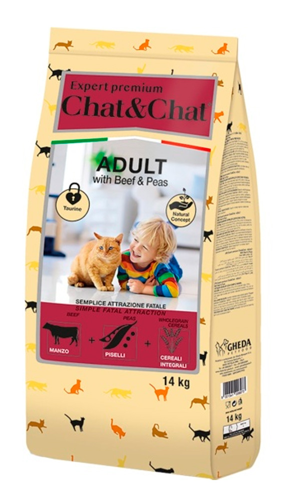 Chat&Chat Expert Adult Cat (Говядина и горох) - полнорационный сухой корм для взрослых кошек со вкусом говядины и гороха.