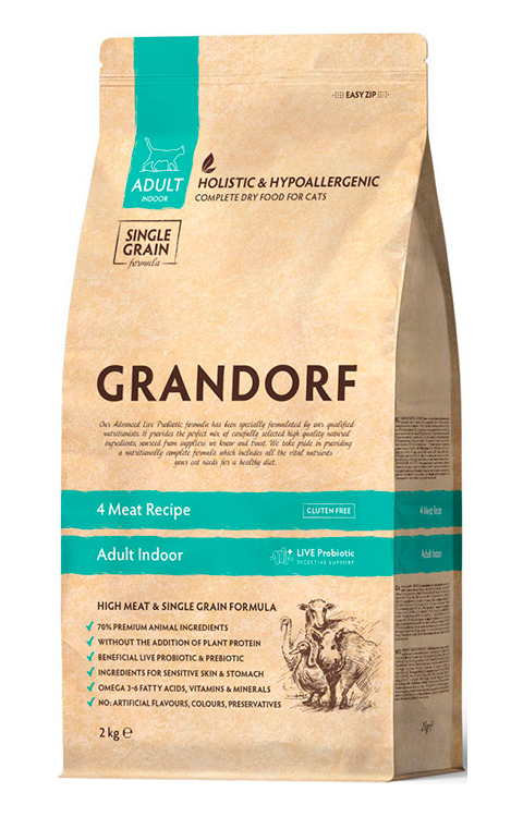 Grandorf Probiotics Adult Indoor (4 вида мяса) - это низкозерновой гипоаллергенный рацион для кошек, содержащий живые пробиотики.