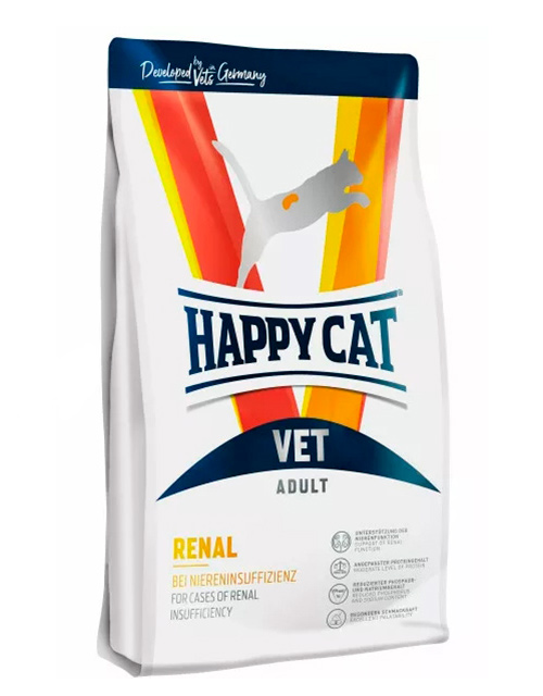 Happy Cat VET Diet Renal - корм для кошек с хронической почечной недостаточностью, гипертензией, нефритом. Сниженное содержание фосфора, натрия и протеина в соответствии с минимальными потребностями. Стимуляция аппетита за счет повышенной вкусовой привлекательности.