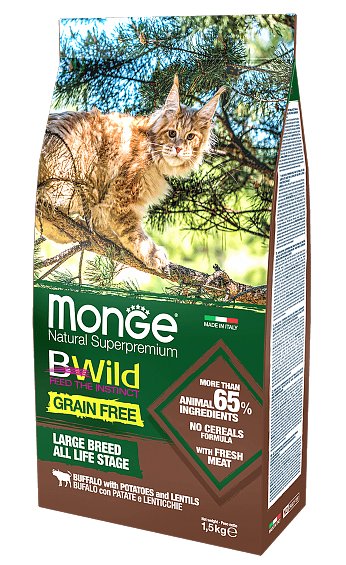 Monge Сat BWild Grain Free Large (Буйвол) - это сбалансированный беззерновой рацион для кошек крупных пород любого возраста с мясом буйвола и картофелем.