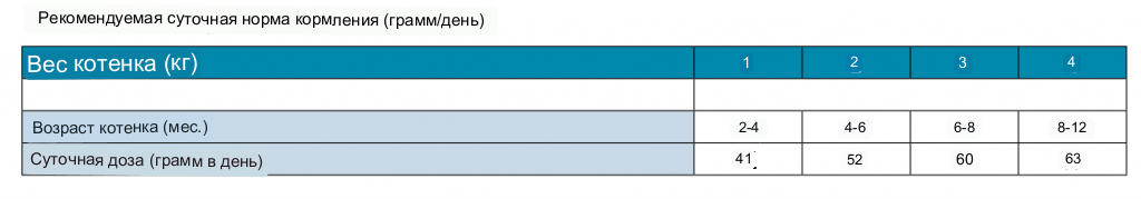 Ежедневное потребление может быть адаптировано в зависимости от размера кошки, физической активности и условий жизни. Рекомендованные суточные дозы, указанные в таблице, можно разделить на три приема пищи. Убедитесь, что всегда есть свежая и чистая вода. Когда этот продукт заменяет другой тип корма и / или диеты, рекомендуется вводить его постепенно в течение как минимум 1 недели. Беременным и / или кормящим кошкам корм можно давать «ad libitum», поскольку потребности кошек варьируются в зависимости от количества котят. Корм для кошек, непригодный для употребления в пищу человеку.