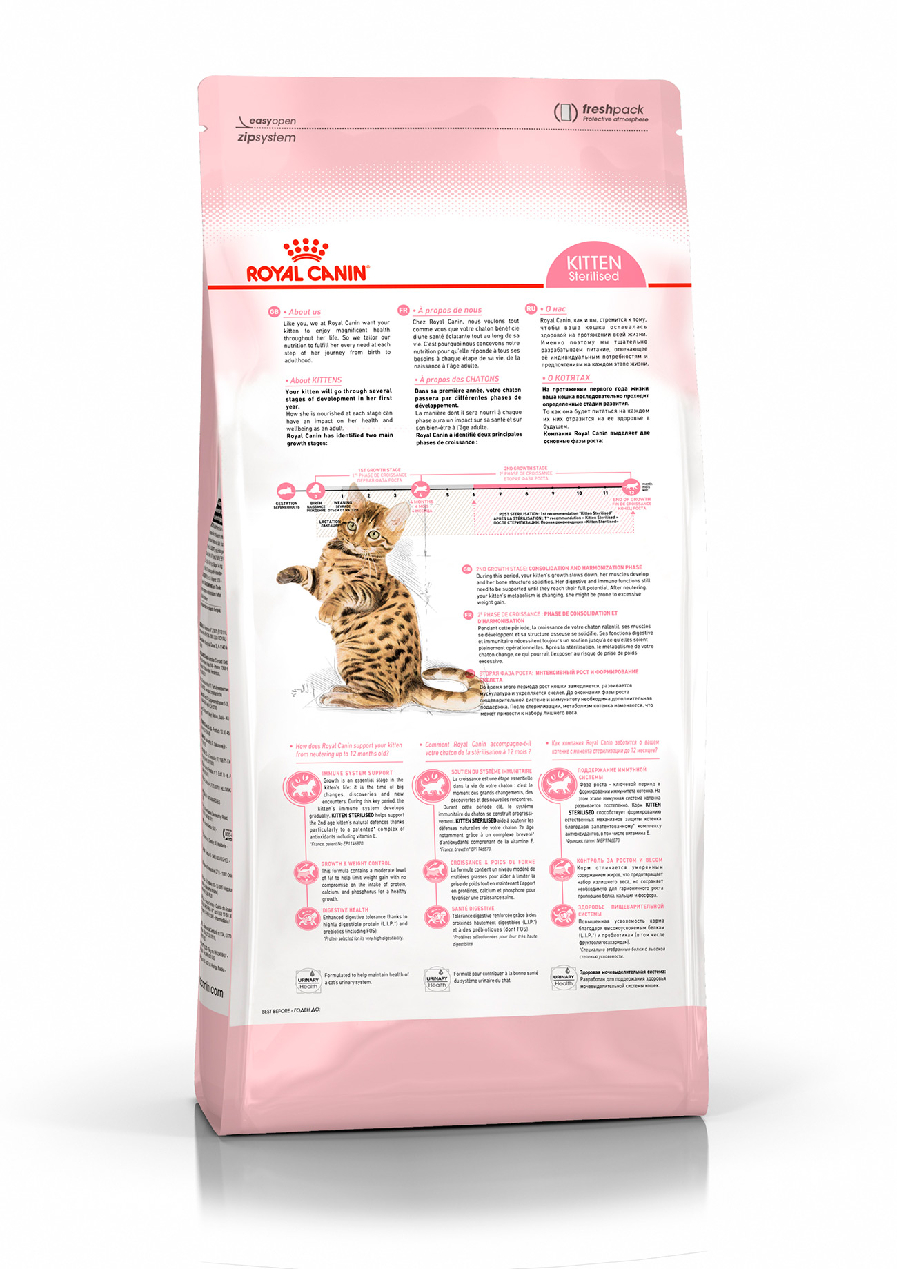 Корм KITTEN STERILISED помогает снизить риск ожирения у стерилизованных котят благодаря адаптированному уровню жиров и сбалансированному содержанию других нутриентов (белков, кальция, фосфора), что способствует гармоничному завершению периода роста котенка.