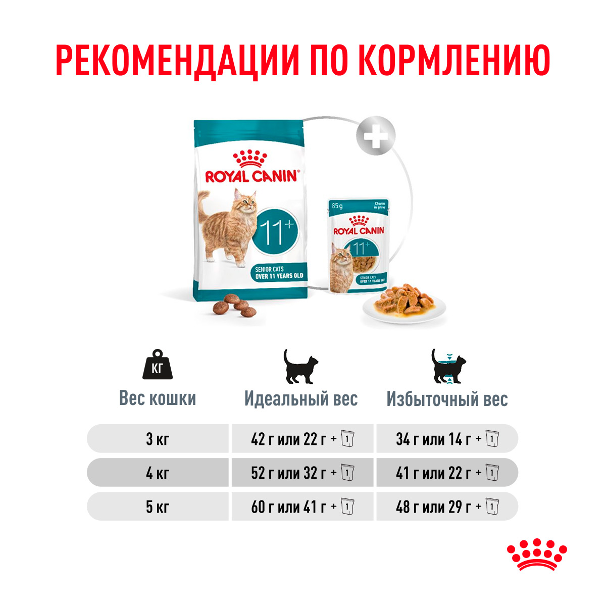 Разработанный специально для пожилых кошек и протестированный с их участием, ROYAL CANIN® Ageing 11+ обладает легкой для поедания текстурой, обеспечивающей вашему питомцу положительный кормовой опыт.