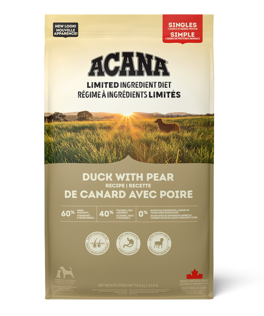 Свежее мясо утки (18%), дегидрированное мясо утки (17%), цельный зеленый горошек, цельная красная чечевица, свежие утиные потрошки (печень, сердце, почки) (7%), утиный жир (6%), свежие груши сорта «Бартлетт» (4%), цельный нут, цельная зеленая чечевица, цельный желтый горошек, сушеные утиные хрящи (2%),клетчатка из чечевицы, морские водоросли – натуральный и биологически доступный источник ДГК и ЭПК (1,2%), свежая цельная мускатная тыква, свежая цельная столовая тыква, сухие бурые водоросли, сублимированная утиная печень (0,1%), соль, свежая цельная клюква, свежая цельная черника, корень цикория, корень куркумы, расторопша, корень лопуха, лаванда, корень алтея, плоды шиповника.
