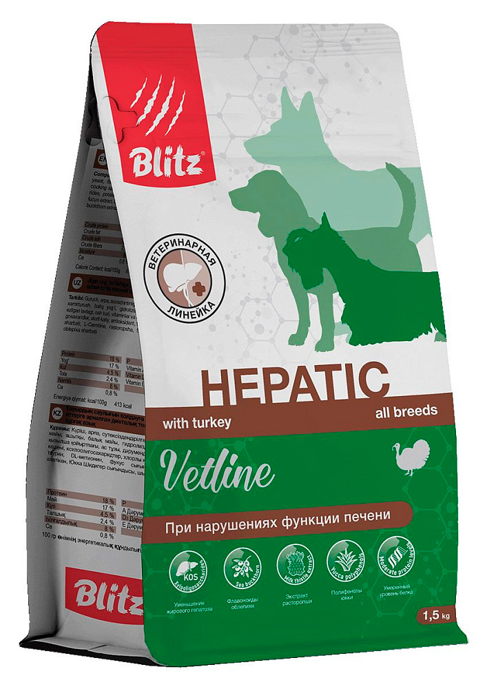 BLITZ Dog Vetline Hepatic (Индейка) – сухой полнорационный диетический корм для собак при нарушении функций печени.