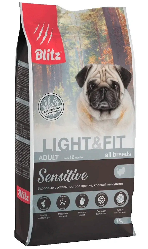 BLITZ Sensitive Adult Light & Fit (Индейка)– сухой корм для взрослых собак с лишним весом.