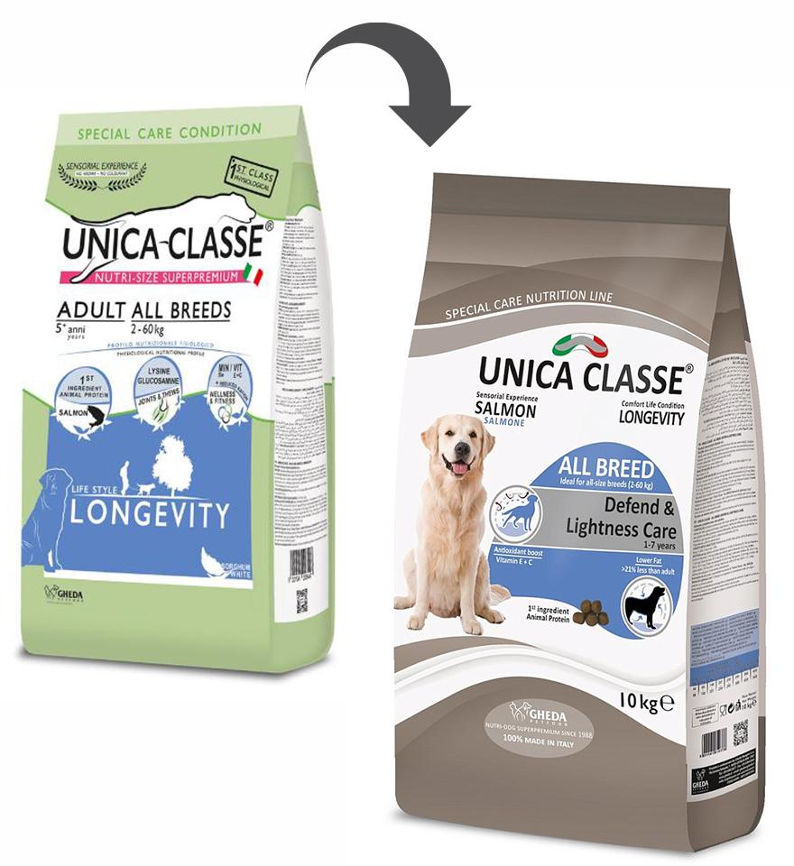 Unica Classe Adult All Breeds Longevity (Лосось) - это полнорационный сухой корм для взрослых и пожилых собак всех пород с массой тела от 2 до 60 кг. Подходит для собак от 5 лет.