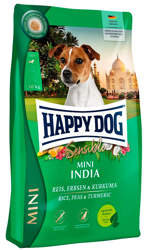 Happy Dog Sensible Mini India – вегетарианский корм с рисом, горошком и куркумой для маленьких собак. Полнорационный корм для взрослых собак весом до 10 кг с нормальным уровнем активности.